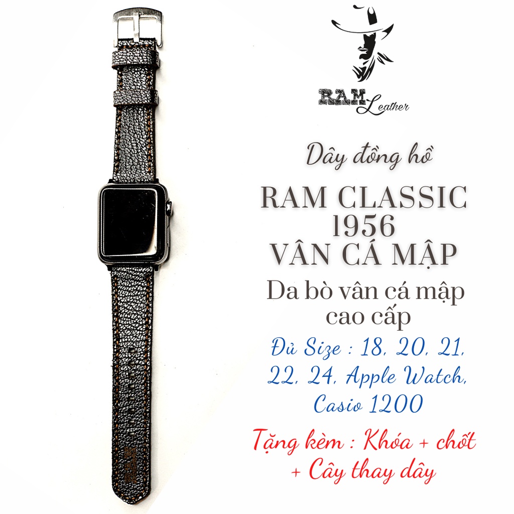 Điện Thoại & Phụ Kiện > Phụ kiện > Phụ kiện cho đồng hồ thông minh || Dây apple watch da bò vân cá mập cực đẹp RAM Leather classic 1956 đen thép - tặng khóa chốt và adapterCòn hàng