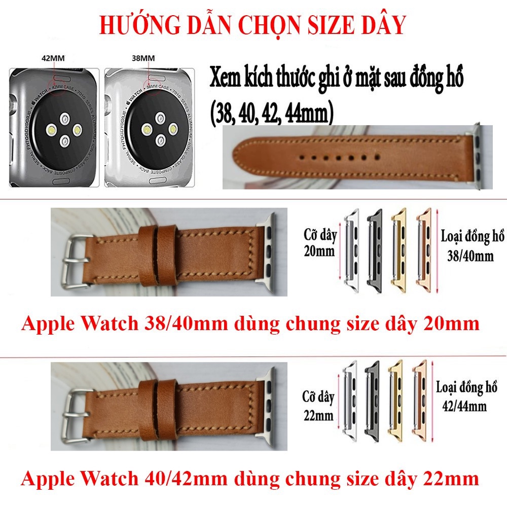 Đồng hồ Apple Watch có 4 size: 38mm, 40mm ( dành cho nữ ) và 42mm, 44mm ( dành cho nam ). Kích thước dây da tương ứng sẽ là: