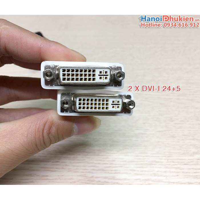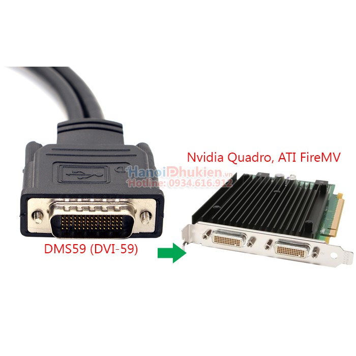 Dây cáp chuyển đổi cổng DMS 59 (tên khác DMS 60, DVI 59, LFH 59, LFH 60) ra 2 cổng DVI (chân cái). Sử dụng kết nối card đồ hoạ ra 2 màn hình máy tính cùng một lúc.2 x DVI loại DVI-I Dual Link (24+5 pin)