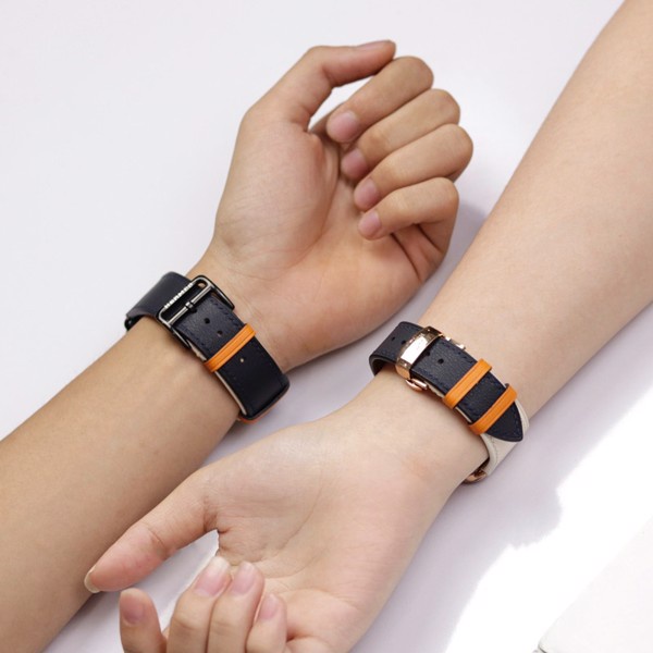 DÂY DA BÊ SWIFT NHẬP KHẨU PHÁP🔸 Chất liệu mặt ngoài: Da Swift nhập khẩu từ Pháp(Da swift có bề mặt mịn, trơn, không có đường vân như da Epsom và không có hạt như da Togo), Do dây da thật swift Xanh Navy phối Trắng cho Apple Watch nhẵn, mịn nên hạn chế được tình trạng bám bẩn so với các loại dây da có đường vân. Bề mặt dây swift cũng không có lớp phủ ngoài nên rất thoáng khí, khả năng đàn hồi tốt, khó bị gãy, nứt.