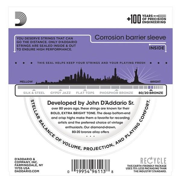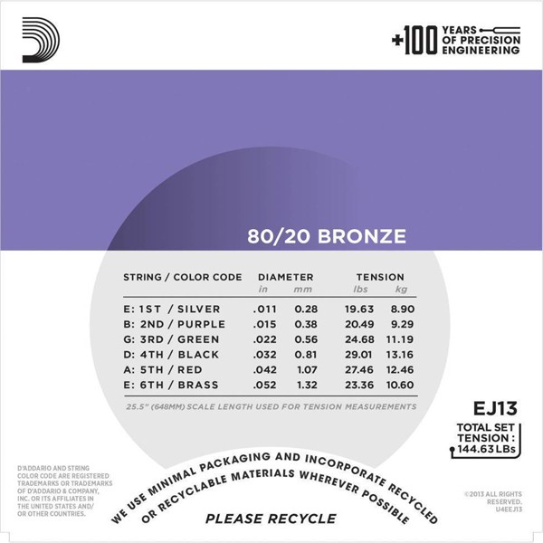 Kích cỡ dây: .011, .015, .022, .032, .042, .052 phù hợp với đa số mọi người chơi và tập luyệnDây đàn D’Addario EJ13 80/20 BRONZE 11-52 làm từ hợp kim đồng, kích cỡ nhỏ (custom light) sản xuất tại Mỹ cho chất lượng âm thanh tốt, tiếng vang và có chiều sâu.