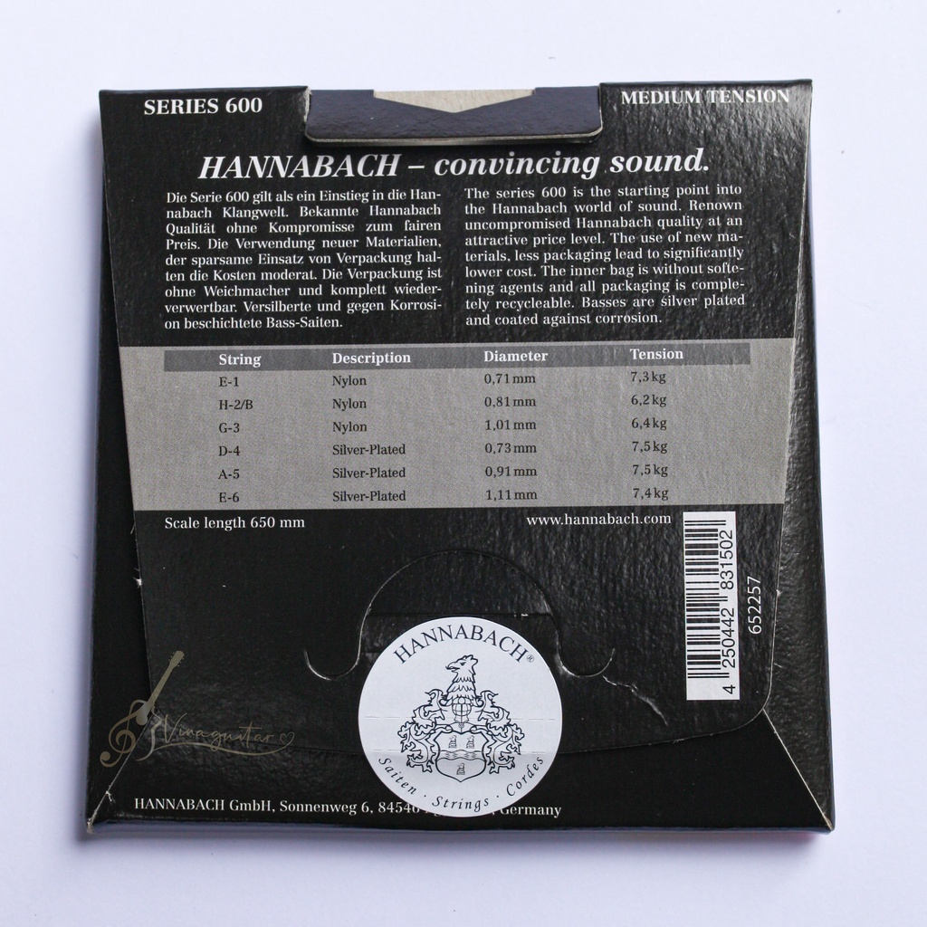 Xịn 100%- CAM KẾT CHÍNH HÃNG- Trực tiếp từ Vũ Đức Hiển- Đại lí Hannabach chính hãng tại Việt NamThương hiệu Hannabach (NYLON) được Anton Hannabach thành lập vào năm 1869 ở Eger, Bohemia. Hannabach cũng được xác nhận bởi một danh sách dài các nghệ sĩ cổ điển hiện đại, bao gồm Rico Stover, Xingye Li, và Melbourne Quartet Guitar. Loại dây guitar mà họ bán chạy nhất hiện nay là dây Hannabach 815.
