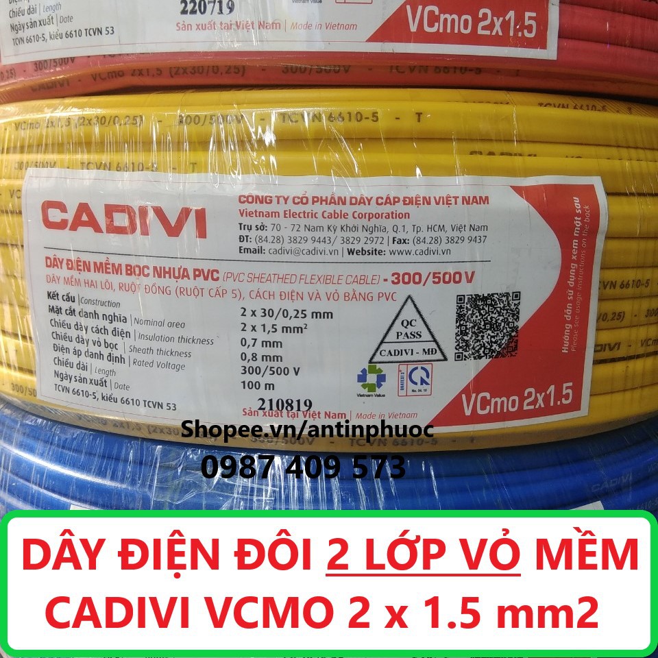 +++ Quý khách có nhu cầu dây có tiết diện to hơn dùng cho tải lớn . Mời tham khảo dây Vcmo 2 x 2.5 mm trong shop . Do dây điện có trọng lượng khá nặng ,nên shop phải tách riêng để tối ưu chi phí vận chuyển cho quý khách .