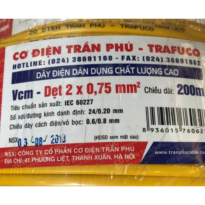 Dây điện trần phú 2x0.75, 2x1, 2x1.5 bảo hành 12 tháng