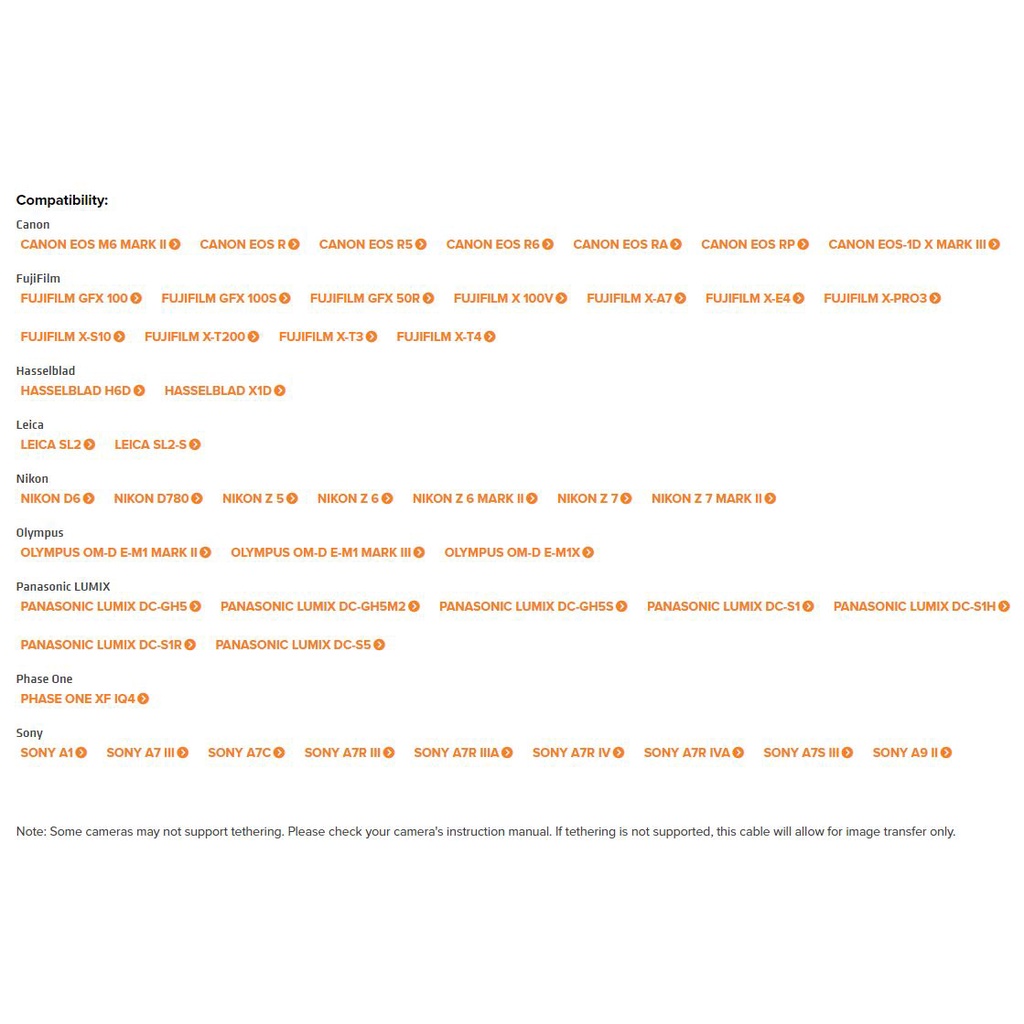 Cáp TetherPro USB-C đến USB 3.0 Micro-B Right Angle cho phép bạn kết nối trực tiếp máy tính USB-C mới với máy ảnh cổng USB 3.0, cho phép kết nối thẳng mà không có bộ điều hợp hoặc khóa. USB-C là công nghệ mới nhất có sẵn để chuyển nhanh nhất và đáng tin cậy nhất.Lưu ý: Cáp chỉ truyền dữ liệu . Không dành cho sạc.Các tính năng chính: