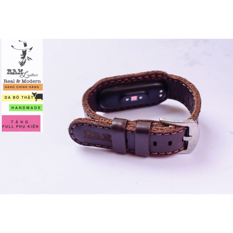 Dây miband RAM Leather da bò thật nâu đậm cao cấp cho miband 3 , miband 4 , miband 5, miband 6