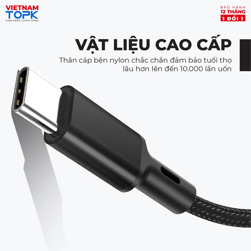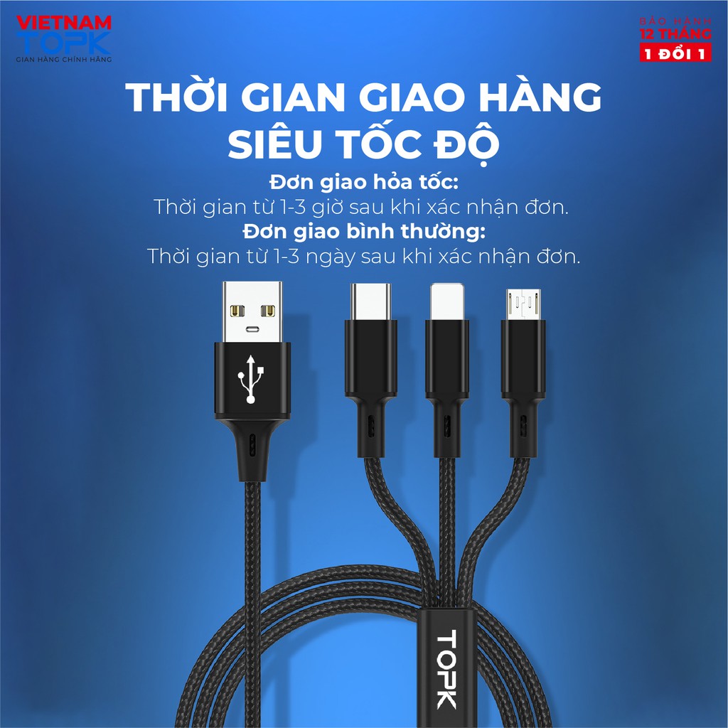 Giới thiệu Dây sạc 3 đầu (iPhone, Type-C, Micro) dùng cho điện thoại TOPK AN20 Vỏ bện nylon dài 1.2m - Hàng phân phối chính hãng