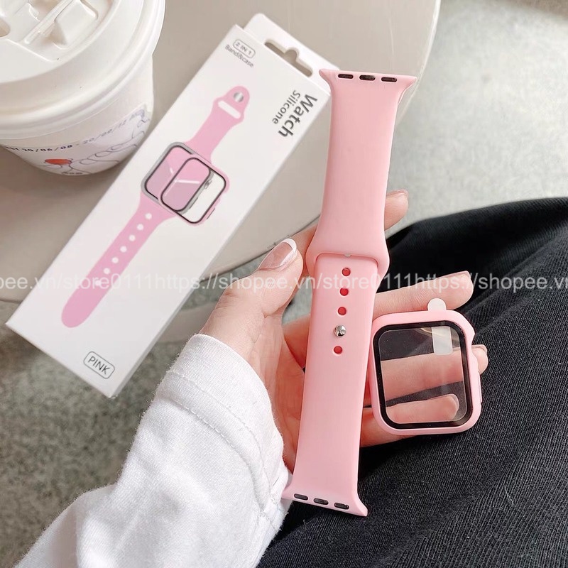 Dây silicon + Ốp kèm kính cường lực dành cho Apple watch 38mm/40mm/41mm/42mm/44mm/45mm