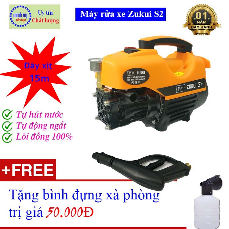 [Dây xịt 15M] Máy rửa xe -máy xịt rửa mini áp lực cao Zukui S2 - 2000W - tự hút nước tự ngắt - tặng bình xịt xà phòng