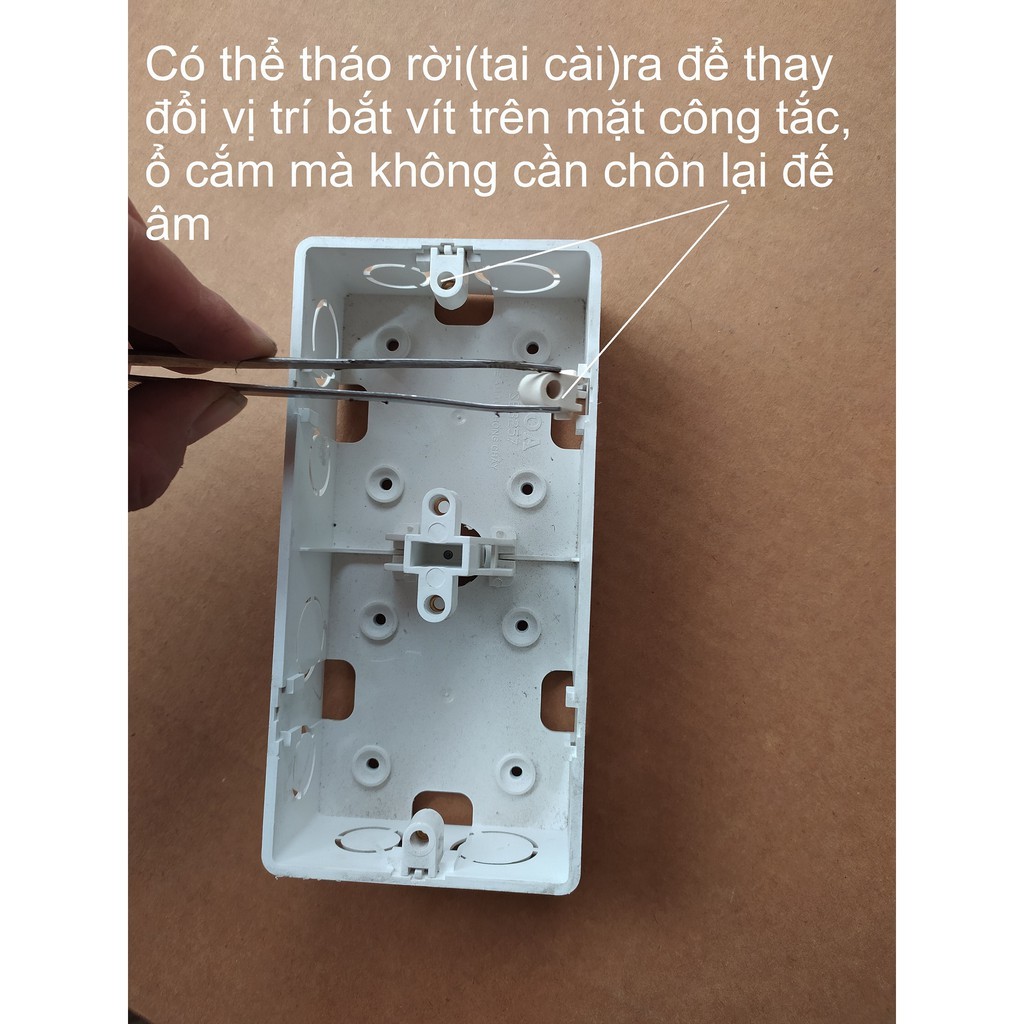 - DẶC BIỆT ở đế vuông là sự thiết kế rất độc đáo, thông minh và hoàn hảo tạo ra các vị trí có thể cài bắt tai vít vào (. tài bắt vít của đế này CÓ THỂ THÁO RỜI nên rất thuận lợi cho việc lthi công. Và với những cái tai bắt vít này mà nó CÓ THỂ THAY ĐỔI ĐƯỢC CHIỀU NẰM NGANG HAY THẲNG ĐỨNG CỦA CÁC MẶT CÔNG TẮC MÀ KHÔNG PHẢI CHÔN ĐẾ LẠI. . các tai chốt rời khi được cài vào đế thông qua hệ thống ray trượt theo hướng càng trượt vào trong càng chắc . nên khi bắt mặt công tắc , ổ cắm vào càng vặn chặt vít thì mặt công tắc , ổ cắm càng chắc.