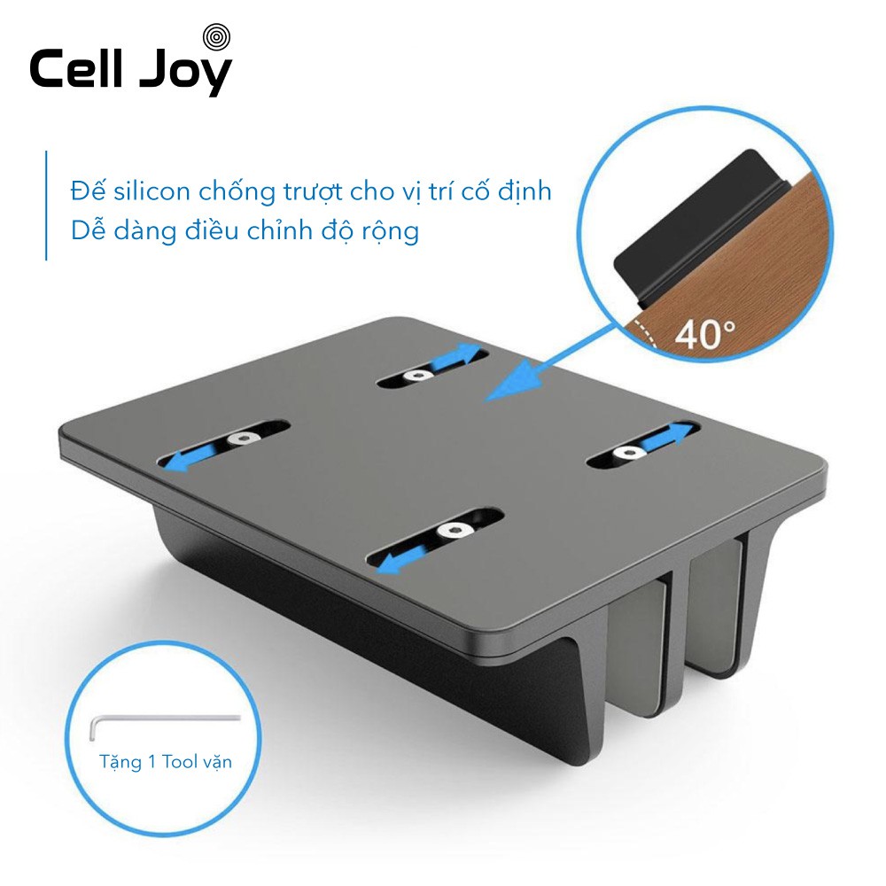 Đế thiết kế thanh trượt linh hoạt, có thể kéo ra hoặc co vào thoải mái 1.7 -> 7.3 cm. Phù hợp với cả Macbook khi mang ốp hoặc kẹp giữ sách khi không cần thiết.