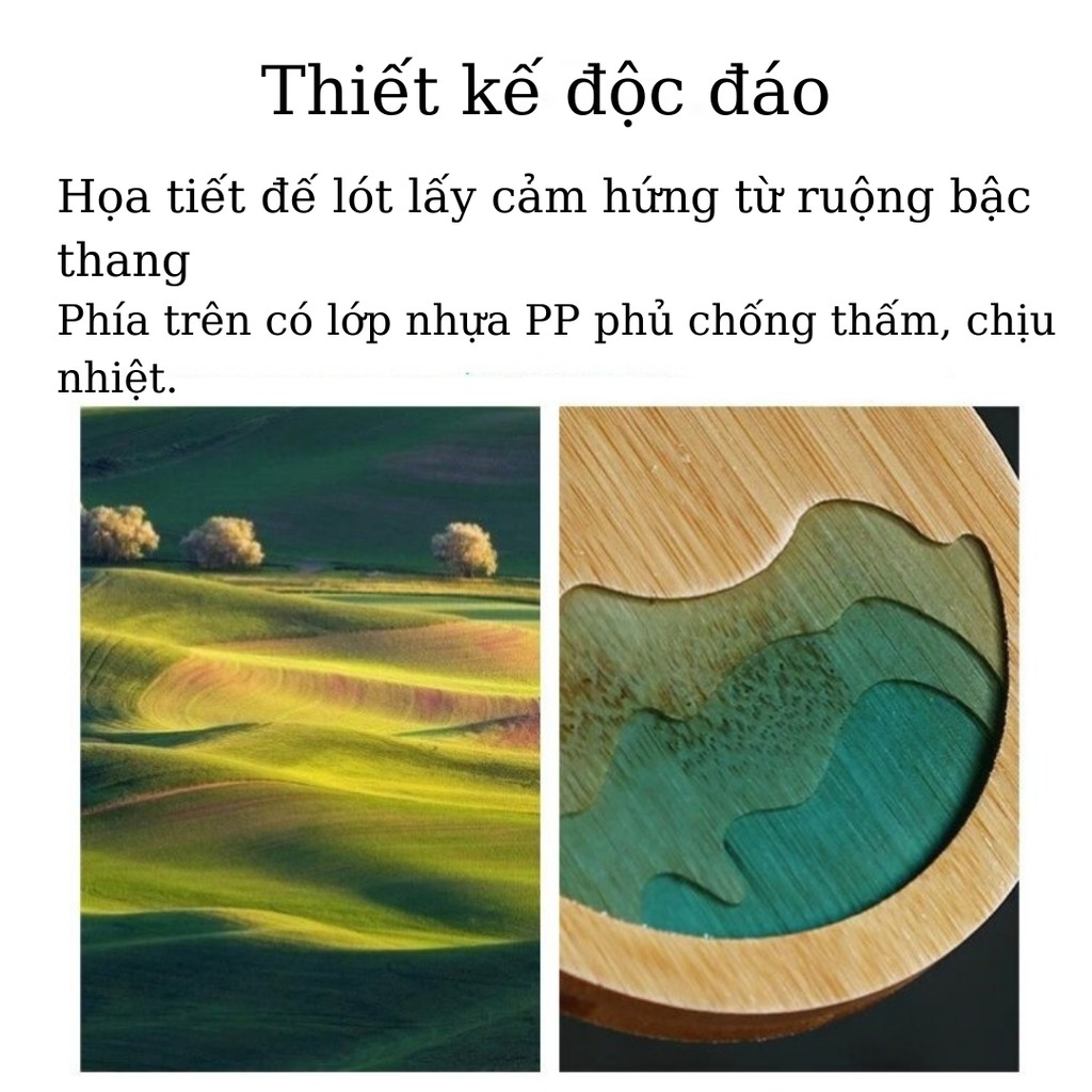 Một chiếc lót ly được thiết kế với kiểu dáng thanh lịch lấy cảm hứng từ hình ảnh ruộng bậc thang xanh mát trên nên chất liệu của tre tự nhiên và lớp tráng nhựa nhiều màu sắc.Hoa văn trên bề mặt tre sử dụng lớp nhựa chống nóng màu sắc khác nhau để thiết kế phong cảnh núi đồi với độ sâu độ cao gần khác nhau. Có lớp nhựa PP chống thấm, chịu nhiệt bao phủ