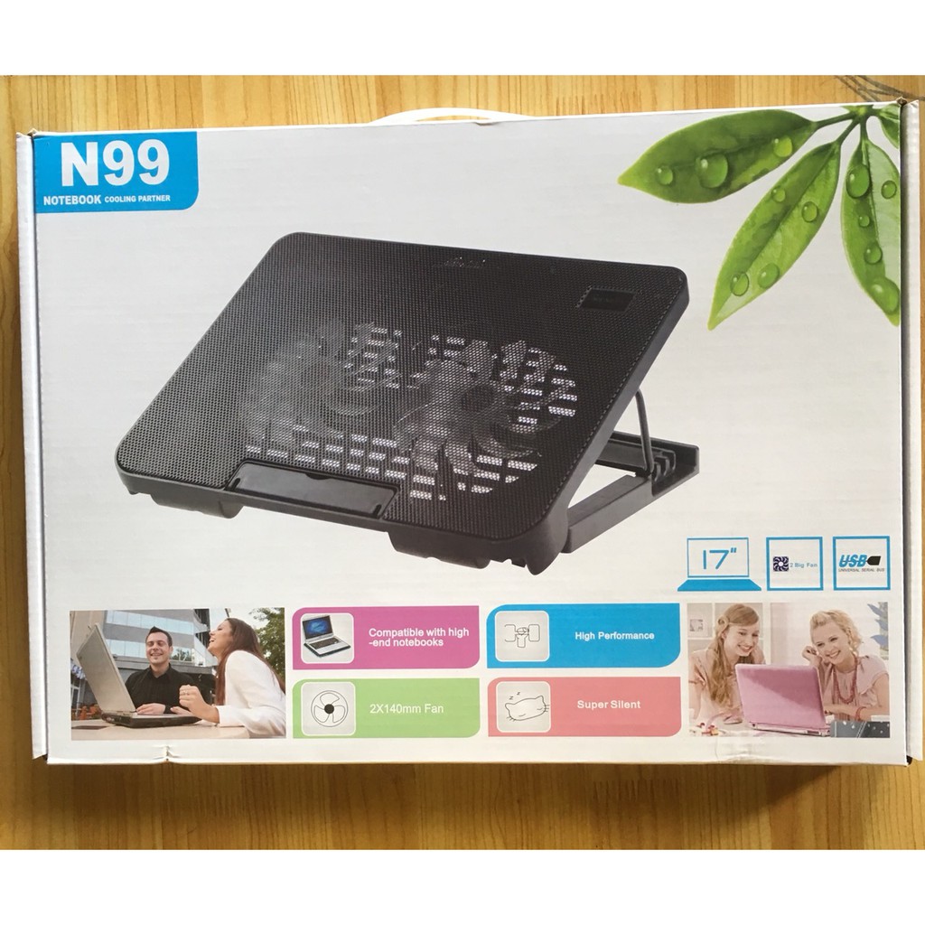 Đế tản nhiệt Cooling Pad N99. Đế tản nhiệt Cooling Pad N99 có thiết kế tương đối nhỏ gọn, phong cách trẻ trung. Chất liệu cứng cáp chịu lực tốt. Hai quạt tản nhiệt: Đế sử dụng 2 quạt làm mát với tốc độ quay khá cao. Giúp tối ưu hóa khả năng làm mát, đặc biệt khi bạn chạy ứng dụng nặng gây nóng máy. Kết nối USB: Cooling Pad N99 dễ dàng kết nối thông qua cổng USB 2.0 Lưới bảo vệ an toàn. Đế tản nhiệt N99 với mặt lưới sử dụng kim loại với các lỗ thông hơi lớn để tăng khả năng tản nhiệt.