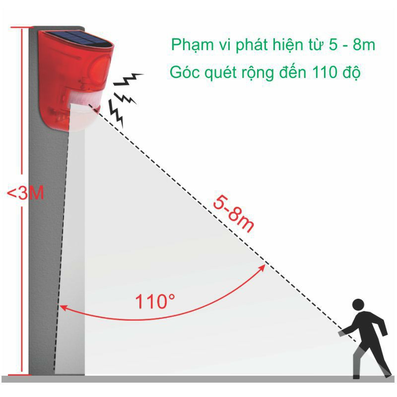 * Lưu Ý : Sản phẩm được cải tiến và nâng cấp, đèn sẽ không kêu khi có người xuất hiện mà sau 30s sẽ kêu để tránh người đi đường chạy qua kêu sẽ ảnh hưởng đến hàng xóm xung quanh.