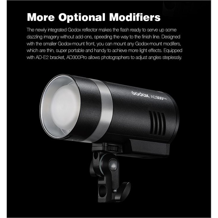 AD300 Pro tự hào có tất cả các tính năng độc đáo của dòng sản phẩm Godox Wistro AD, đồng thời cung cấp công suất mạnh 300W và duy trì, thiết kế nhỏ gọn di động của nó. Với đầu đèn flash tròn, AD300 Pro có thể cung cấp các hiệu ứng ánh sáng mềm và đều ở cấp độ studio.