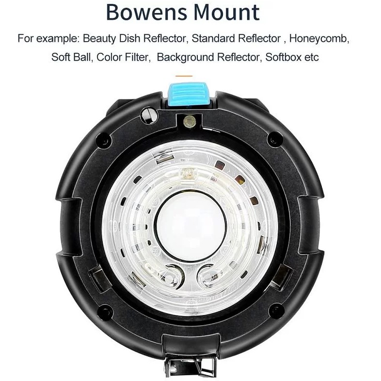QS1200II của Godox cũng có giá đỡ phụ kiện Bowens phía trước cho phép nó sử dụng bộ điều chỉnh Godox cũng như các phụ kiện từ nhiều nhà sản xuất sử dụng hệ thống này. Đầu có giá đỡ nghiêng và chạy bằng nguồn điện chính từ 100 đến 120 VAC.