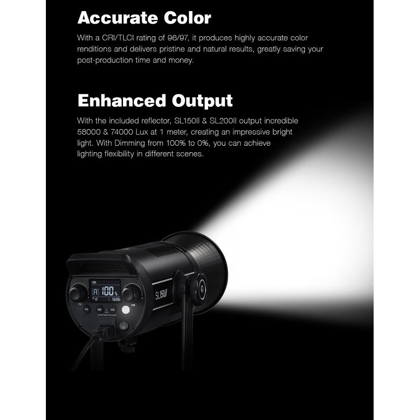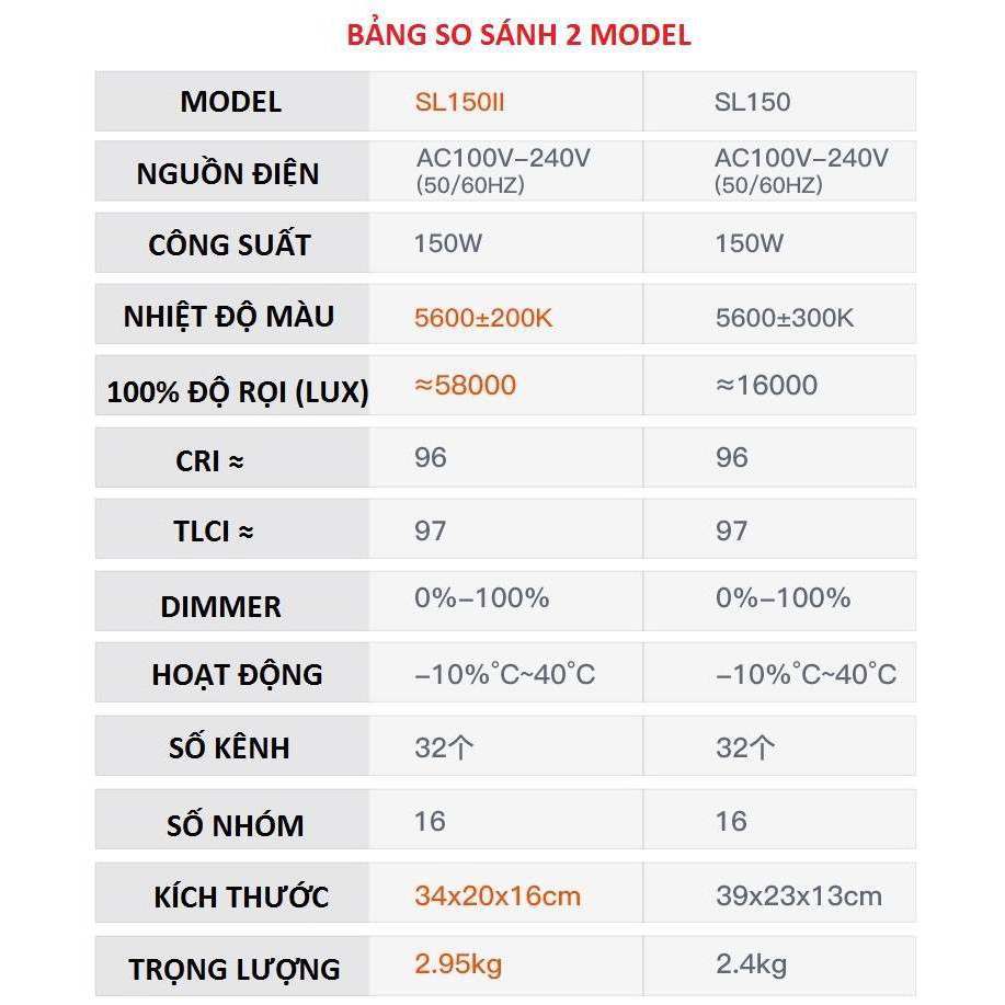 Đèn led Godox studio SL150 II được hãng Godox cho ra đời vào năm 2020, được cải tiến từ SL150 là một 150W LED monolite kiểu nguồn sáng ban ngày cân bằng thích hợp cho phát sóng, kỹ thuật quay phim, online trực tuyến, và các ứng dụng video khác. Đèn SL150W II có cường độ ánh sáng mạnh hơn rất nhiều so với dòng SL150 đời 1 ( SL150 II : 58.000 lux ở 3,28 ‘/ 1 m so với SL150 : 7200 lux at 3.3’ / 1 m). Đèn có thể điều chỉnh độ sáng từ 0% đến 100% tùy theo người sử dụng.THÔNG SỐ KỸ THUẬT: