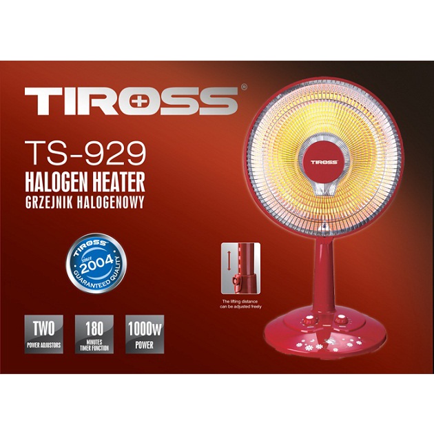Đèn sưởi halogen kiểu quạt Tiross TS929 được thiết kế với màu trắng - đỏ sang trọng, sử dụng bóng halogen giúp tạo hơi ấm cực nhanh và không đốt cháy oxy tốt cho sức khỏe, nhất là với người già và trẻ em. Chế độ xoay đều 180 độ giúp tỏa hơi ấm lan đều khắp phòng sẽ giúp cả căn phòng ấm lên nhanh chóng.Lồng và thân quạt được làm bằng nhựa chắc chắn, chịu va đập. Chế độ hẹn giờ tiện dụng để quạt sưởi tự mở hoặc tự tắt, sẽ giúp bạn kiểm soát tốt hơn thời gian bật tắt quạt. Đèn sưởi Tiross sử dụng công nghệ làm ấm bằng bóng halogen cùng công suất 1000W giúp sưởi ấm nhanh chóng.