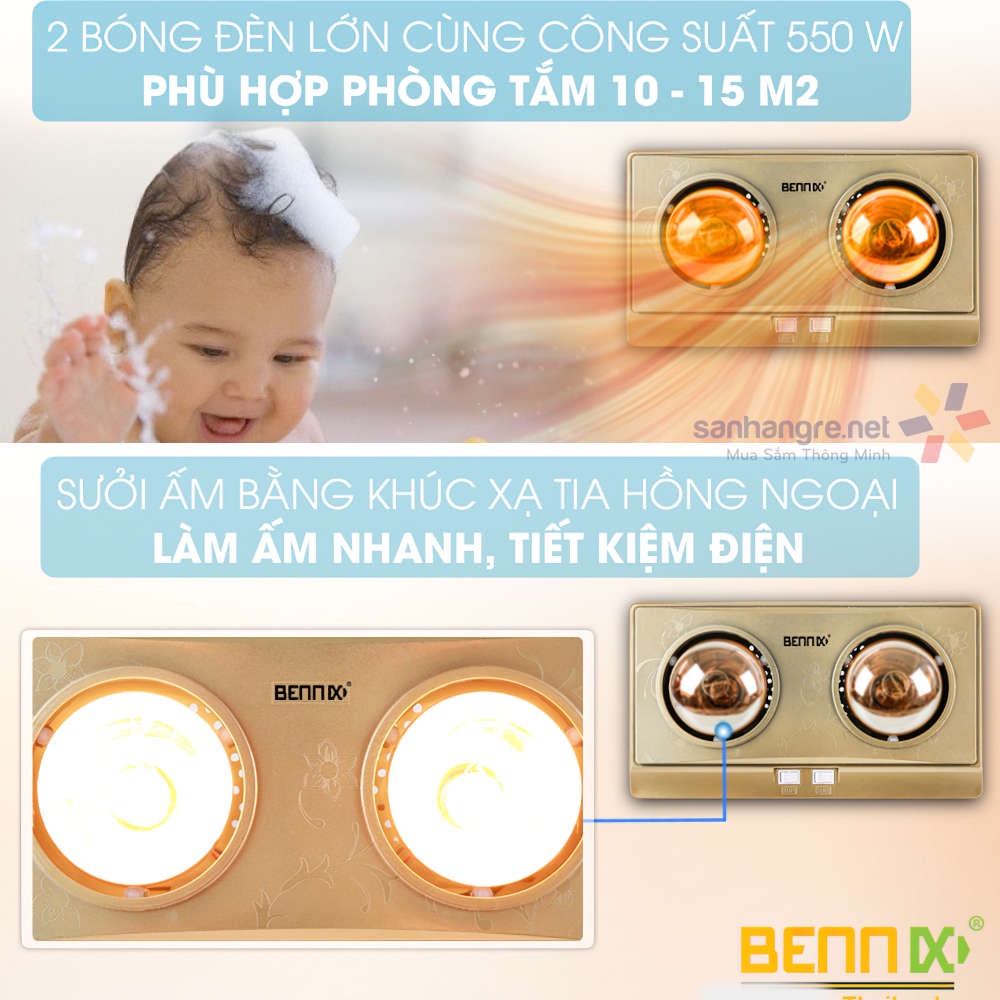Thiết Bị Điện Gia Dụng > Thiết bị điện gia dụng lớn > Máy sưởi || Đèn sưởi nhà tắm 2 bóng Bennix Thái Lan BN-2G hàng chính hãng bảo hành 36 thángCòn hàng