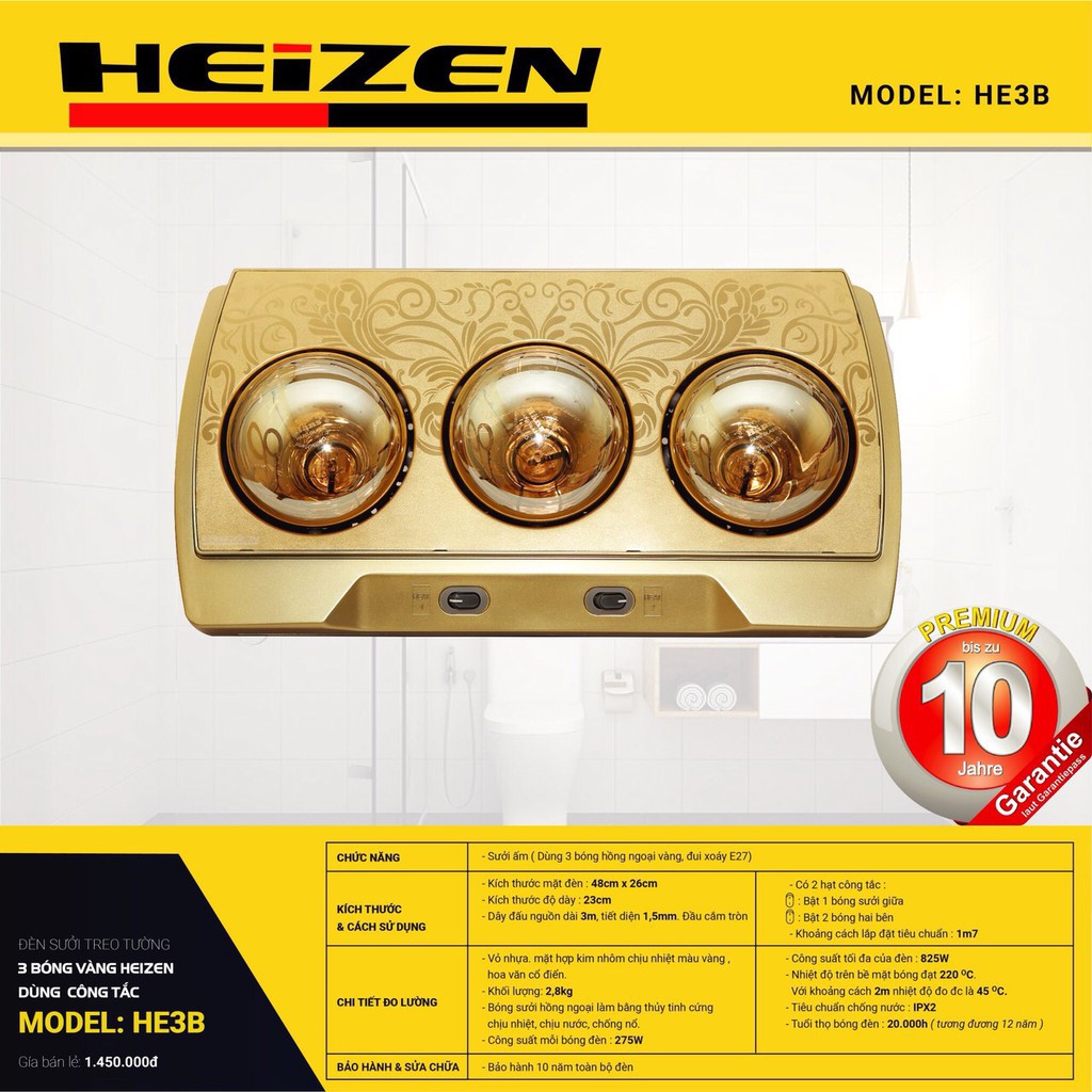 Giới thiệu Đèn sưởi nhà tắm Heizen HE3B 3 bóng vàng, có công tắc - Bảo hành 10 năm