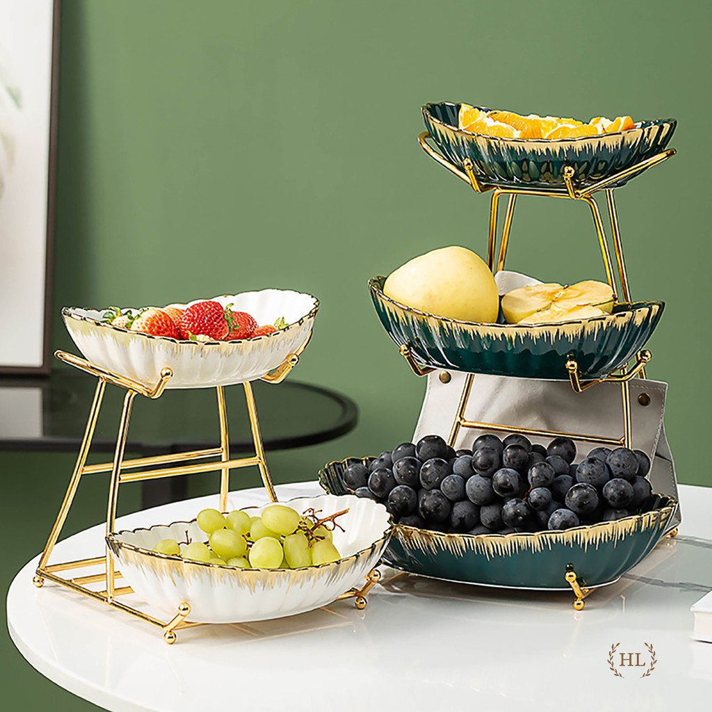 ĐĨA 2 3 TẦNG SỨ TRẮNG XANH VIỀN VÀNG VÂN SỌC KÈM KỆ INOX CAO CẤP 2022