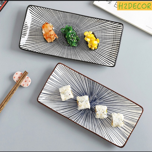 Giới thiệu Đĩa gốm hình chữ nhật hoạ tiết kẻ sọc xanh phong cách Nhật Bản tráng men đĩa cao cấp - H2DECOR