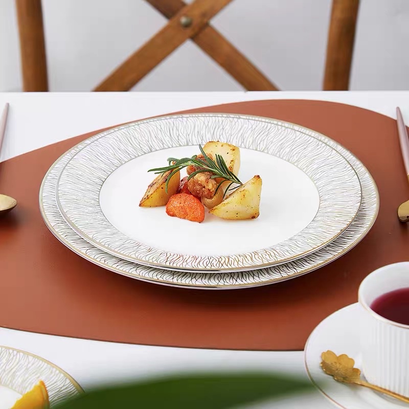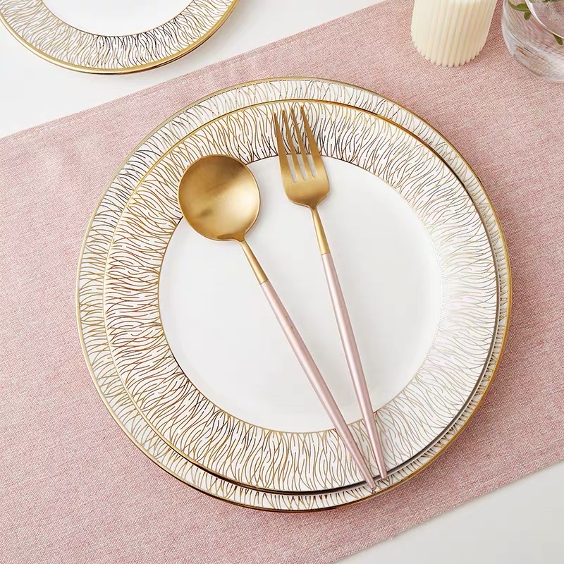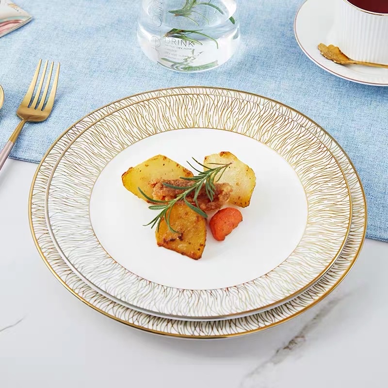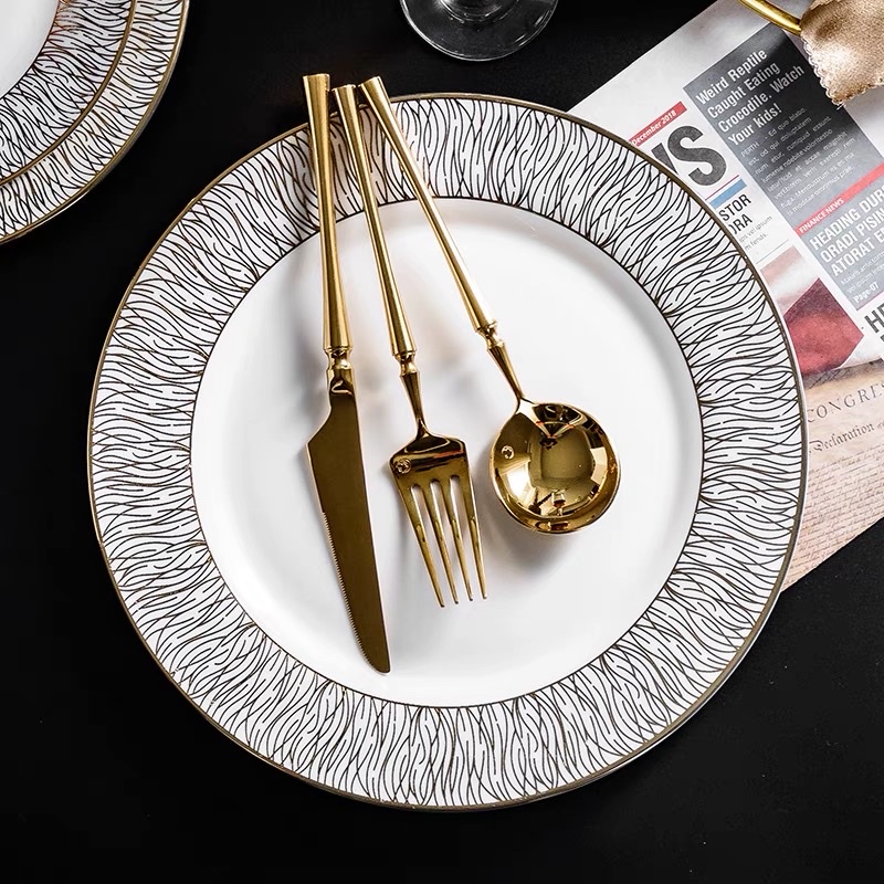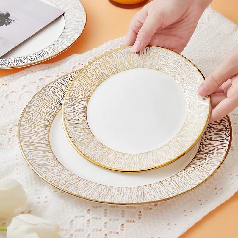 Đĩa phong cách Bắc Âu sang trọng, viền vàng, ăn tiệc cao cấp, để salad, ăn chính,bát soup