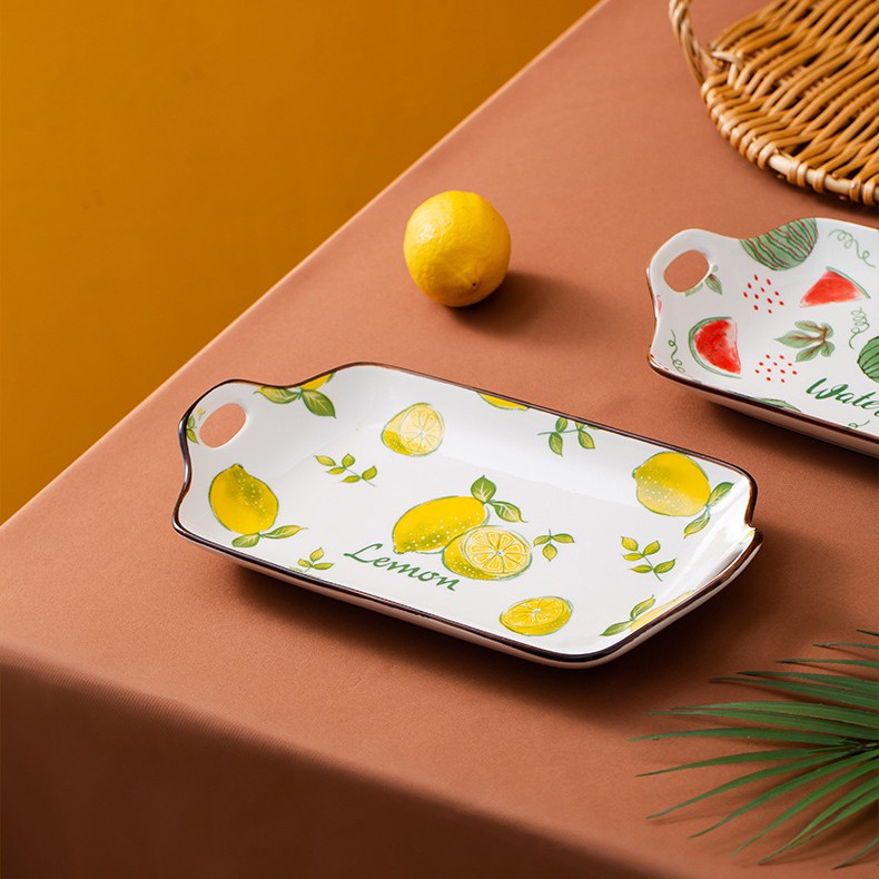 Đĩa sứ hình chữ nhật có tay cầm - 6 họa tiết trái cây - dùng cho bàn ăn và decor - Alifs