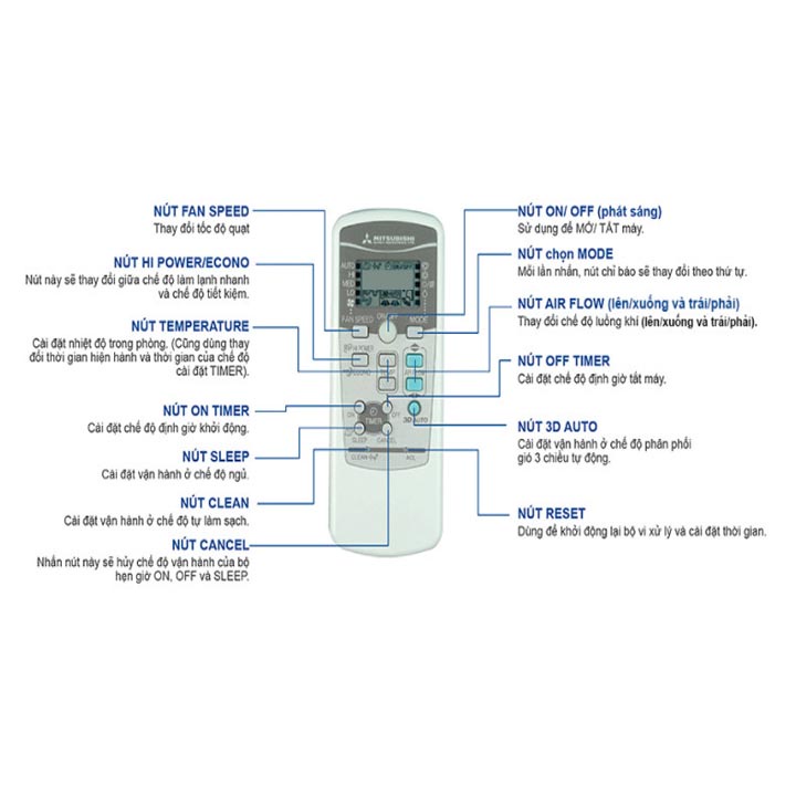 Nút HI POWER/ECONO là nút chuyển đổi giữa chế độ tăng cường độ mạnh và chế độ tiết kiệm điện cho máy lạnh Mitsubishi.