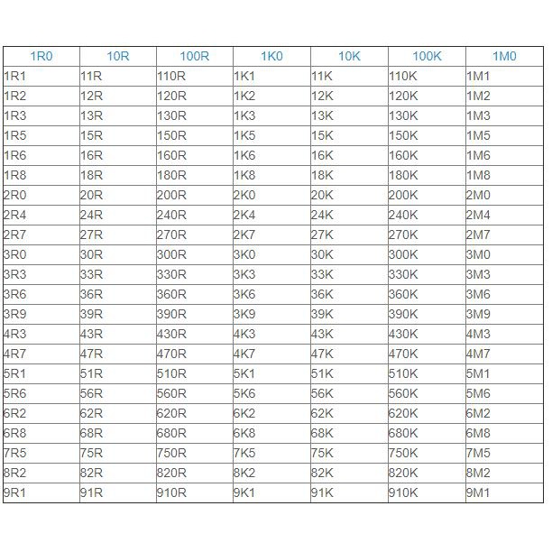 1R0 10R 100R 1K0 10K 100K 1M0 1R1 11R 110R 1K1 11K 110K 1M1 ...