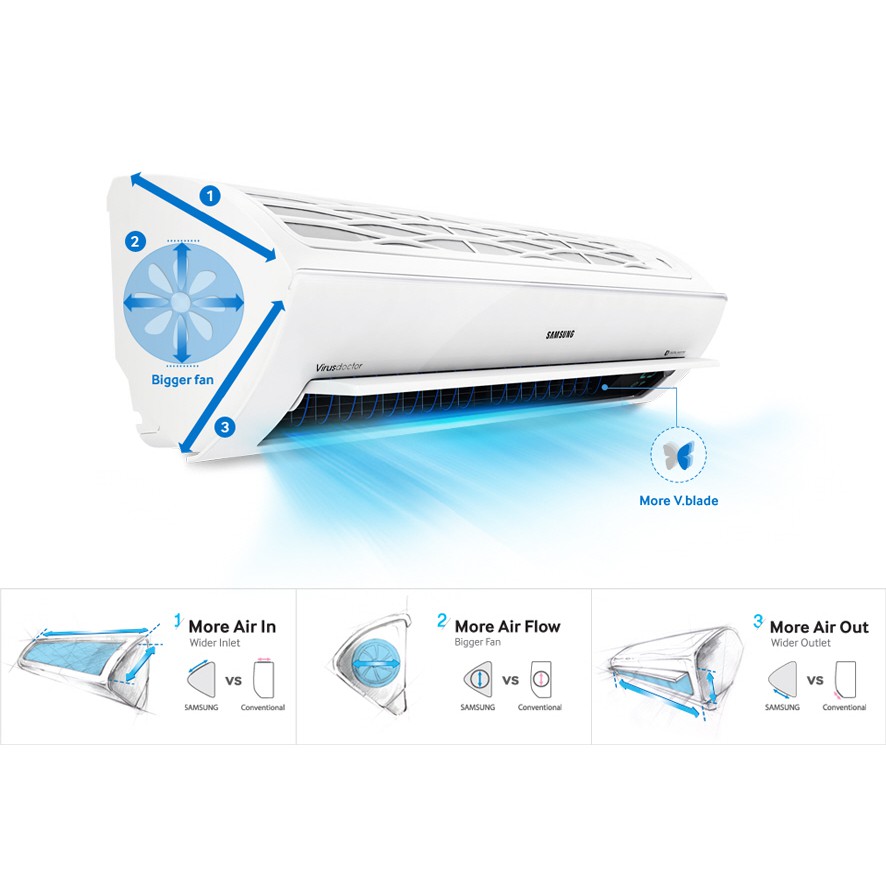 Máy điều hòa Samsung được thiết kế hoàn toàn mới mang đến hiệu quả vượt trội hơn. Thiết kế Tam diện độc đáo với bề mặt hút khí rộng hơn để hút lượng khí nhiều hơn. Độ rộng, các góc của miệng thổi khí, số lượng cánh đảo gió được cải tiến đáng kể, cùng với quạt gió lớn giúp làm mát nhanh hơn, xa hơn* - để bạn tận hưởng không khí trong lành thoải mái, dù ở nơi đâu trong nhà.