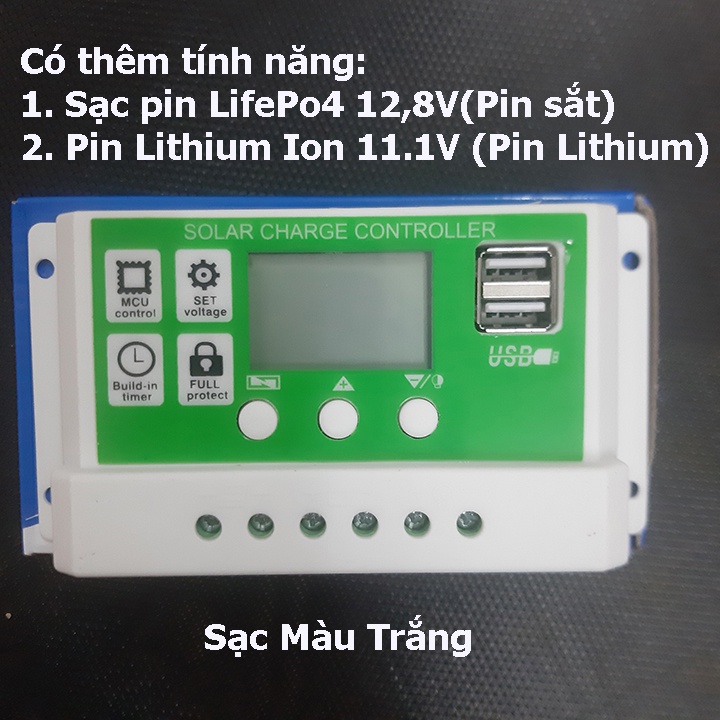 * Sạc màu trắng 12v/24v/30A: Hỗ trợ ắc quy axit chì (B01 12V/24V tự động), Pin lithium ion (B02 11,1V), Pin lithium iron phosphate (LiFEPO4) (B03 12,8V)