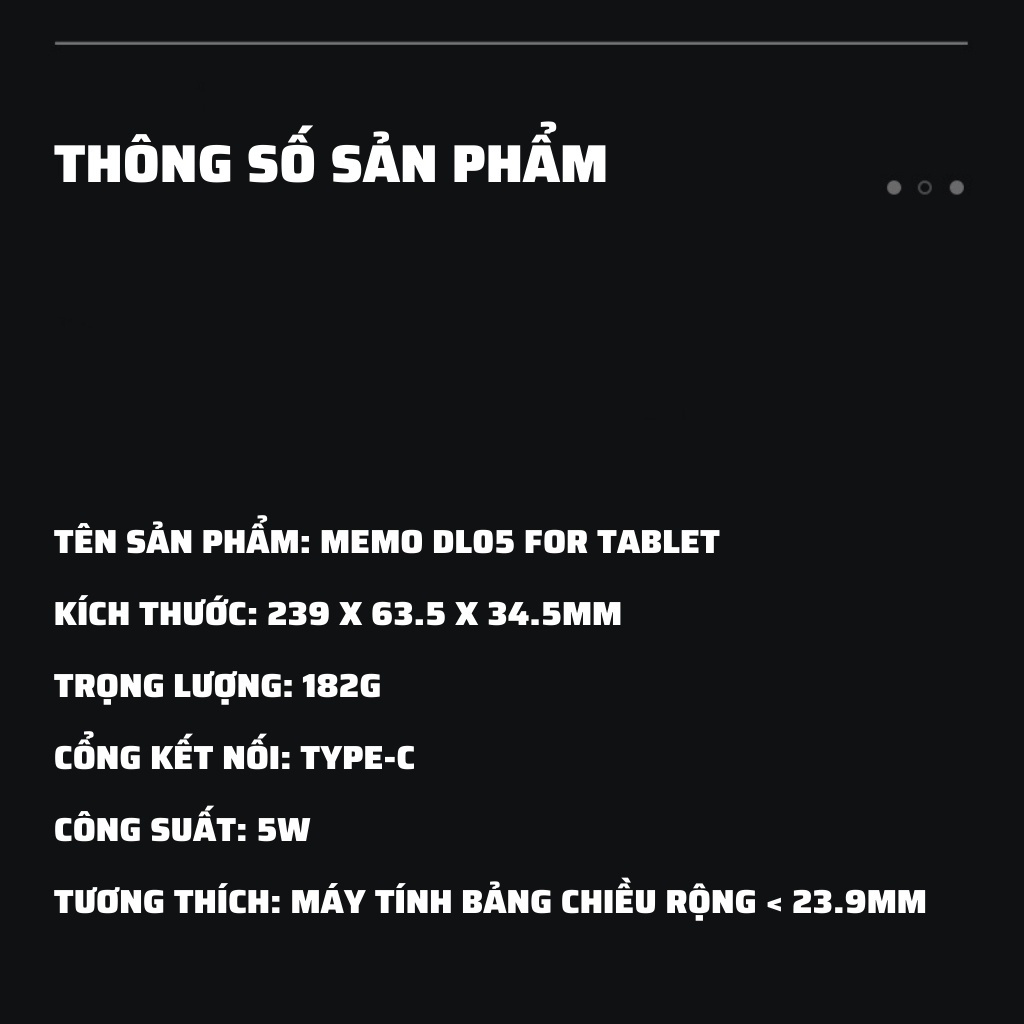 Gace store xin giới thiệu “QUẠT TẢN NHIỆT SÒ LẠNH MEMO DL05” phiên bản dành cho ipad và máy tính bảngSau thành công của phiên bản MEMO DL05 cho điện thoại, hãng Memo lại tiếp tục cho ra mắt phiên bản MEMO DL05 cho máy tính bảng QUẠT TẢN NHIỆT IPAD MEMO DL05 vẫn kế thừa những giá trị cốt lõi làm lên thương hiệu của sản phẩm như tốc độ làm lạnh nhanh, đèn led rgb, màn hình hiển thị nhiệt độ, ngoài ra phiên bản dành cho máy tính bảng được trang bị thêm bộ ngàm kẹp có chiều dài lên tới 23.9 cm để có thể sử dụng cho các loại máy tính bảng trên thị trường
