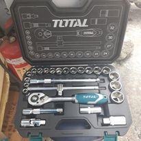 Bộ 25 cái đầu cắm gồm: 1 đầu ratchet vặn 1/2" DR.,45T. 18 đầu cắm 1/2" size: 10-11-12-13-14-15-16-17-18-19-20-21-22-23-24-27-30-32mm; 1 khớp nối 1/2" DR.; 2 thanh mở 1/2" DR. size 125mm & 250mm; 2 đầu cắm spark plug: 16mm & 21mm; 1 thanh trượt chữ T 1/2" *250mm. Chất liệu: CV (50BV30), chịu nhiệt. Đóng gói theo quy cách Total BMC+ hộp màu - 4/T