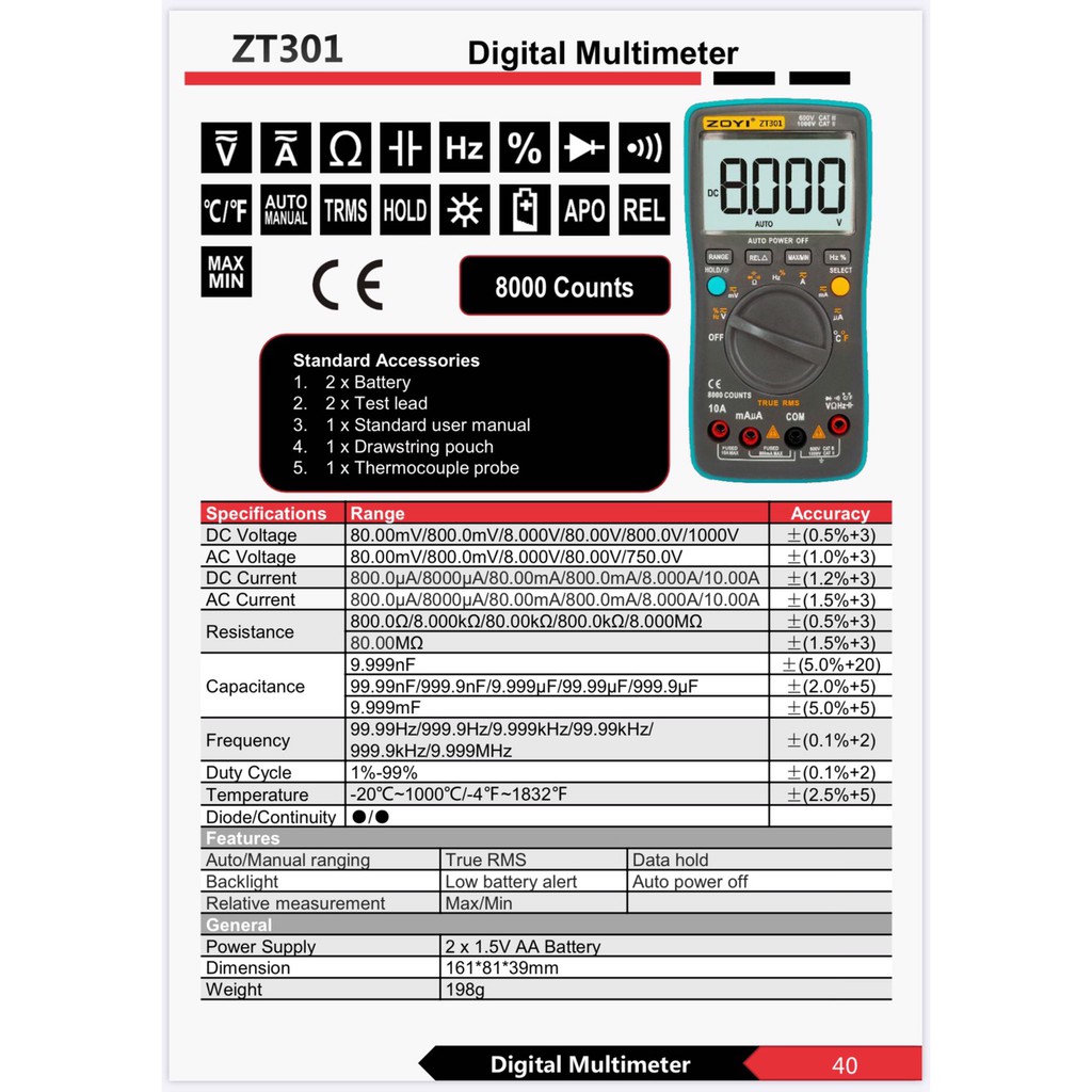 Đồng Hồ Đo Điện Vạn Năng Zoyi Zt-301 Đo Điện Đa Năng Hiển Thị Kỹ Thuật Số 8000 Số Đếm Đo Tụ, Tần Số- Hàng Chính Hãng
