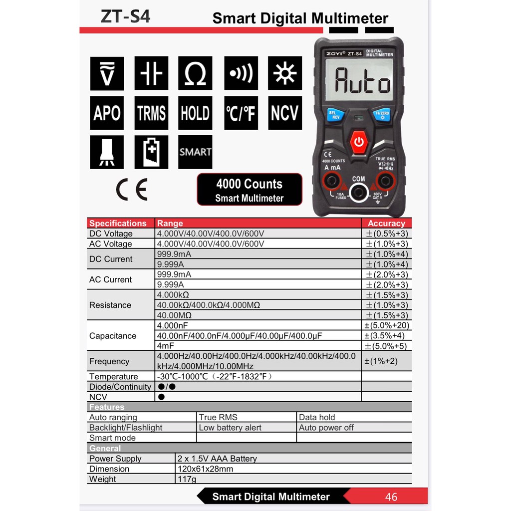 Đồng Hồ Đo Điện Zoyi Zt-S4 Đo Điện Vạn Năng Tự Động - Hàng Chính Hãng - Bảo Hành 12 Tháng