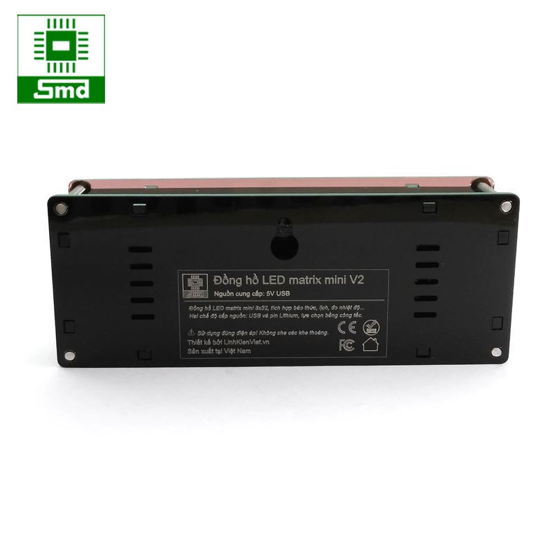 Đồng hồ led matrix mini V2 là sản phẩm đồng hồ do SMD electronics nghiên cứu, phát triển và sản xuất. Với tiêu chí mang lại những giá trị tốt nhất với giá thành hợp lí nhất, sản phẩm Đồng hồ led matrix mini V2 đã giữ lại những ưu điểm của phiên bản V1 và cải thiện được các khuyết điểm còn tồn tại. Đem lại một sản phẩm nhỏ gọn, chất lượng và thẩm mỹ.Sản phẩm có menu điều hướng thông minh, khoa học giúp ta dễ dàng truy cập, cài đặt các chức năng qua các biểu tượng dễ hiểu: hẹn giờ, chọn chế độ hiển thị, tăng giảm độ sáng, âm thanh,chỉnh ngày giờ... và ĐẶC BIỆT nạp chữ vào đồng hồ để chạy lên tới 250 kí tự. Cập nhật phần mềm và nạp hiệu ứng bằng mạch nạp USB.
