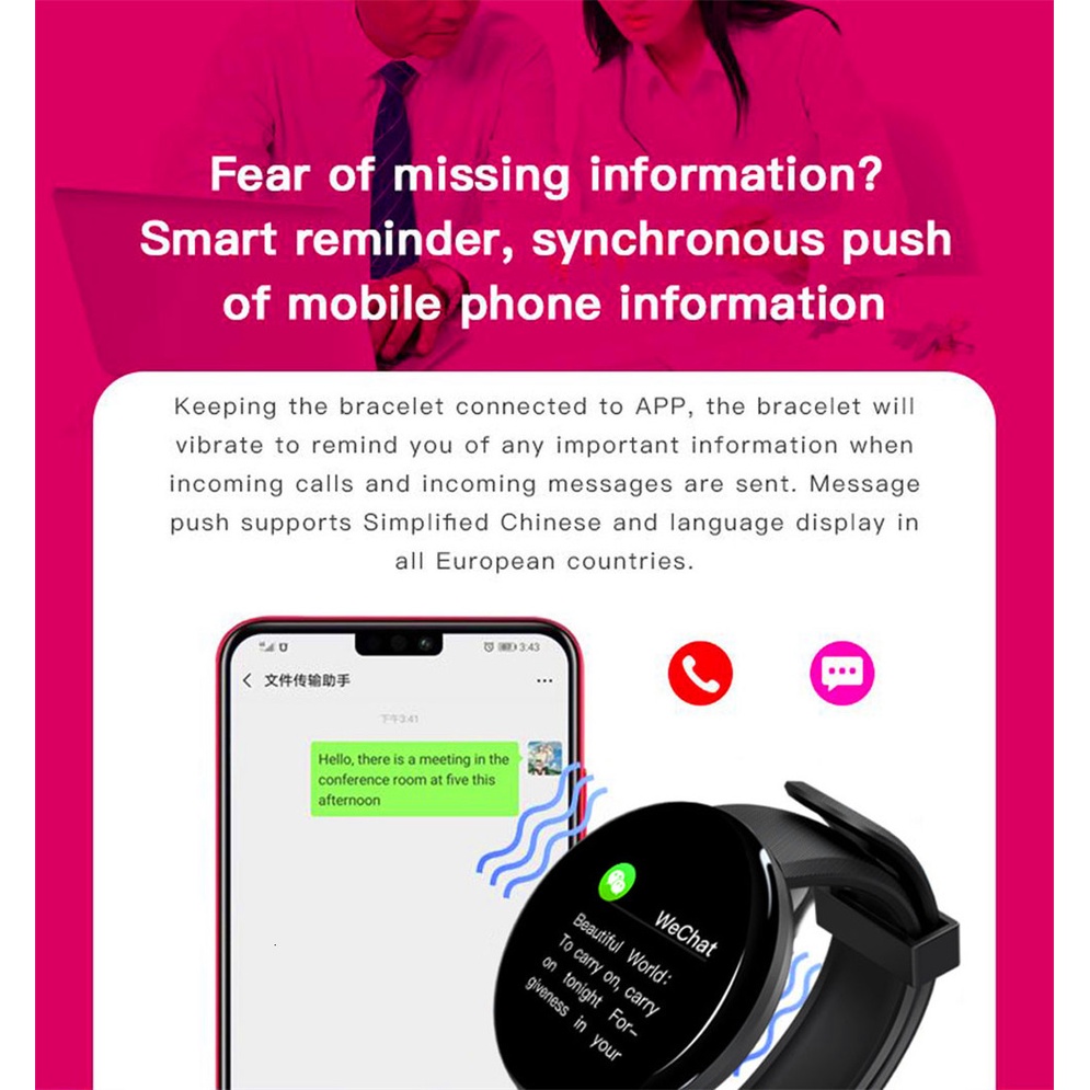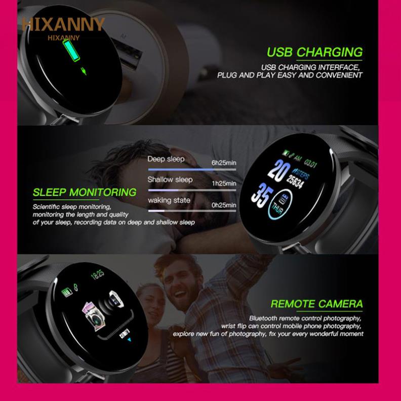 Tính bước đi, quãng đường, calo, theo dõi nhịp tim, đo huyết áp, đo lượng oxy trong máu, theo dõi giấc ngủ, nhắc nhở cuộc gọi, tin nhắn, nhắc nhở ít vận động, chế độ đa thể thao, đồng hồ báo thức thông minh, giơ tay để làm sáng màn hình, tìm vòng đeo tay, tìm điện thoại di động, hình ảnh từ xa, thông báo QQ, WeChat, 7 ứng dụng trò chuyện nước ngoài.Mã sản phẩm: D18