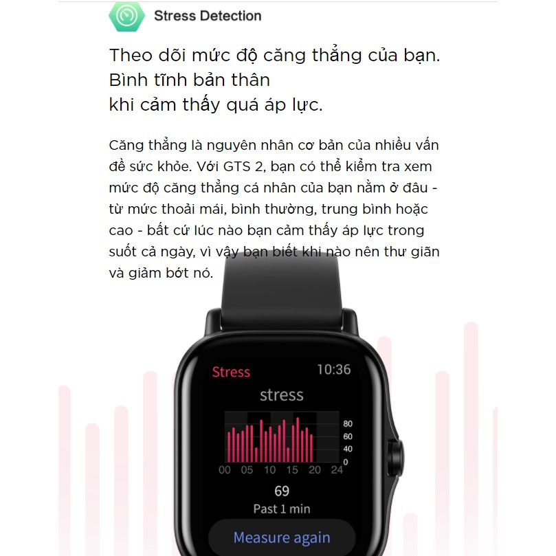 Căng thẳng là nguyên nhân cơ bản của nhiều vấn đề sức khỏe. Với GTS 2, bạn có thể kiểm tra xem mức độ căng thẳng cá nhân của bạn nằm ở đâu - từ mức thoải mái, bình thường, trung bình hoặc cao - bất cứ lúc nào bạn cảm thấy áp lực trong suốt cả ngày, vì vậy bạn biết khi nào nên thư giãn và giảm bớt nó.