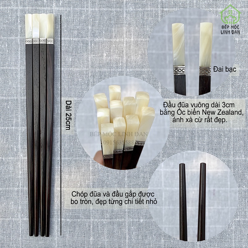Đũa cao cấp - Gỗ trắc đầu ốc biển New Zealand gắn đai bạc- HÀNG SIÊU SANGĐây là mẫu đũa cao cấp, tất cả nguyên liệu đều được lựa chọn loại 1, chóp đũa làm từ ốc biển nhập khẩu từ New Zealand và Úc (vùng biển sạch nhất thế giới, những loại ốc quý hiếm và bào ngư mới sống được), gắn với thân đũa bằng đai bạc, tạo nên sự sang trọng bậc nhất và khác biệt trên bàn ăn gia đình, trên bàn tiệc hay trong nhà hàng cao cấp; Thân đũa được làm từ gỗ trắc tự nhiên 100% để mộc, được chọn lọc gỗ loại 1, toàn bộ thớ dọc nên thân đũa cứng, ít cong vênh, chống gãy, không bị mốc, dùng lâu không bị mủn đầu, xước dăm.