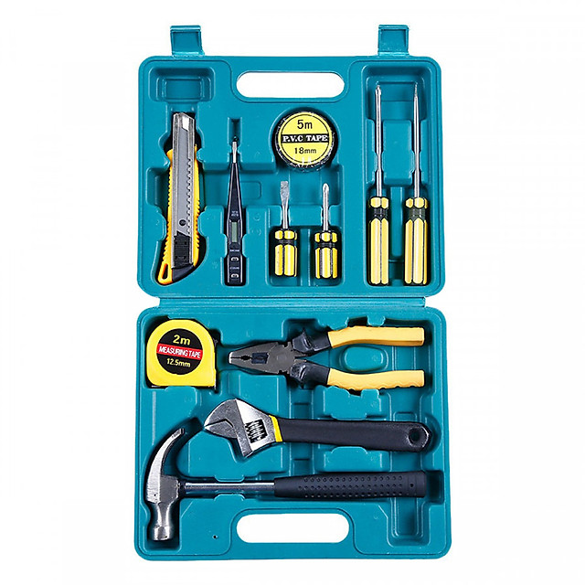 Sản phẩm gồm 12 món: cờ lê, mỏ lết, kìm, búa, tua vít, lục lăng, bút điện, keo, thước, dao dọc giấy, thước kéo, băng dính điện.
