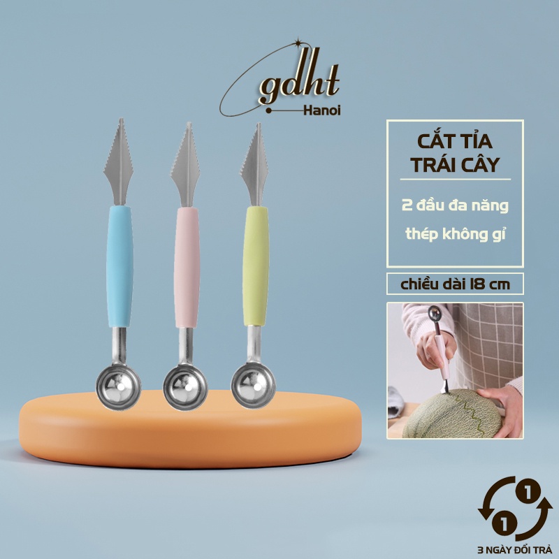 Muỗng hai đầu được thiết kế gồm 2 đầu, một đầu dùng để múc các loại quả mềm như dưa hấu, đu đủ, thanh long… một đầu để tỉa rau củ, hoa quả, cho bạn gái thể hiện sự khéo léo và cắt tỉa nhiều dĩa hoa quả bắt mắt cho cả gia đình.