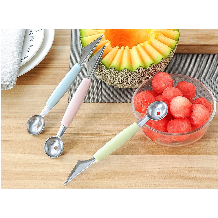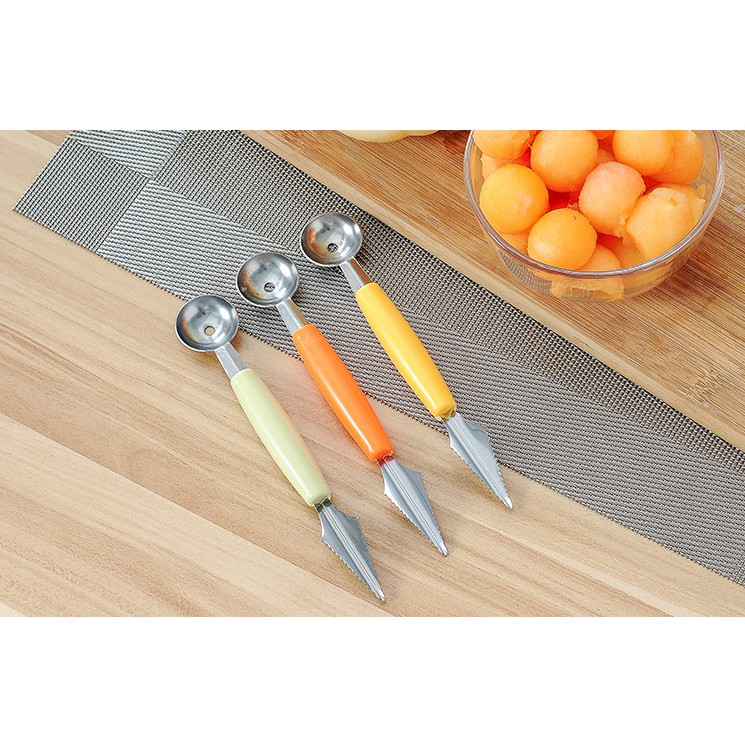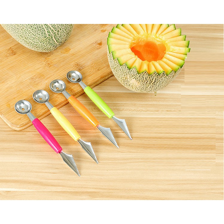 ❆ Muỗng hai đầu được thiết kế tiện dụng gồm 2 đầu, một đầu dùng để múc các loại quả mềm như dưa hấu, đu đủ, thanh long… muỗng xoay 360, tạo ra các khối tròn. Ngoài ra sản phầm còn có thể dùng múc kem thành những viên tròn xinh xắn, hấp dẫn để làm món kem ốc quế, kem thuyền mát lạnh….❆ Một đầu để tỉa rau củ, hoa quả bắt mắt, dùng để tạo ra các đường nét sâu có hình tam giác.