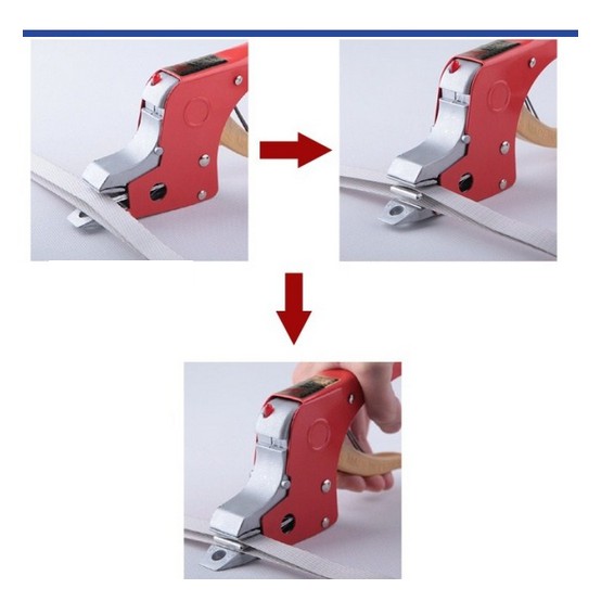 Đầu tiên ta dùng kiềm siết đai để căng dây đai. Khi độ căng đạt yêu cầu ta dùng kẹp nhiệt để hàn 2 đầu dây lại. Cho 2 đầu dây vào vị trí trên và dưới lưỡi gà, bóp hờ trong thời gian khoảng 5 giây, sau đó bóp mạnh để lưỡi gà thụt lại. Khi đó dây đai đã được hàn