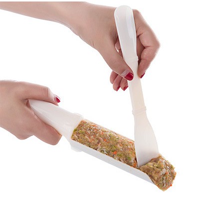 Dụng Cụ Làm Thịt Viên Siêu Nhanh được thiết kế gồm 1 đầu nhỏ, 1 đầu to và 1 thìa gạt giúp bạn tạo những viên thịt đều nhau mà không lo bẩn tayChỉ cần cho giò sống, hoặc chả đã băm để vào đầu nhỏ hoặc đầu to (tùy bạn chọn) rồi dùng đũa gạt xuống là được.