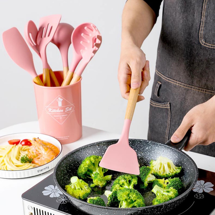 + Bộ dụng cụ nấu ăn được thiết kế lỗ treo dễ khô và dễ bảo quản, thiết kế công thái học, tay cầm cong đẹp, không biến dạng, không làm hỏng nồi, dễ lau chùi, không nứt, không dính.