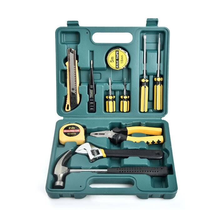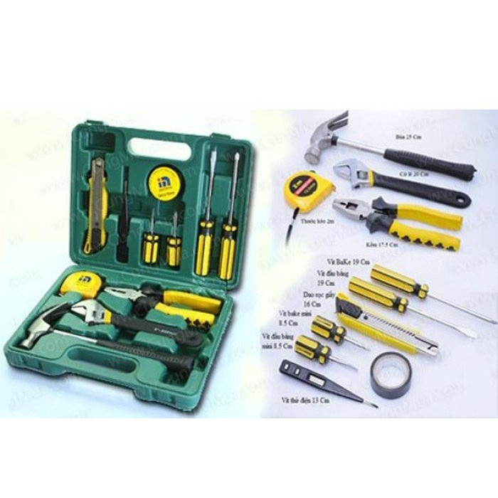- Gồm 16 món: cờ lê, kềm, búa, tua vít, keo, thước, dao dọc giấy, thước kéo, băng dính điện…, công cụ hỗ trợ hiệu quả cho công việc sửa chữa các vật dụng điện trong nhà.