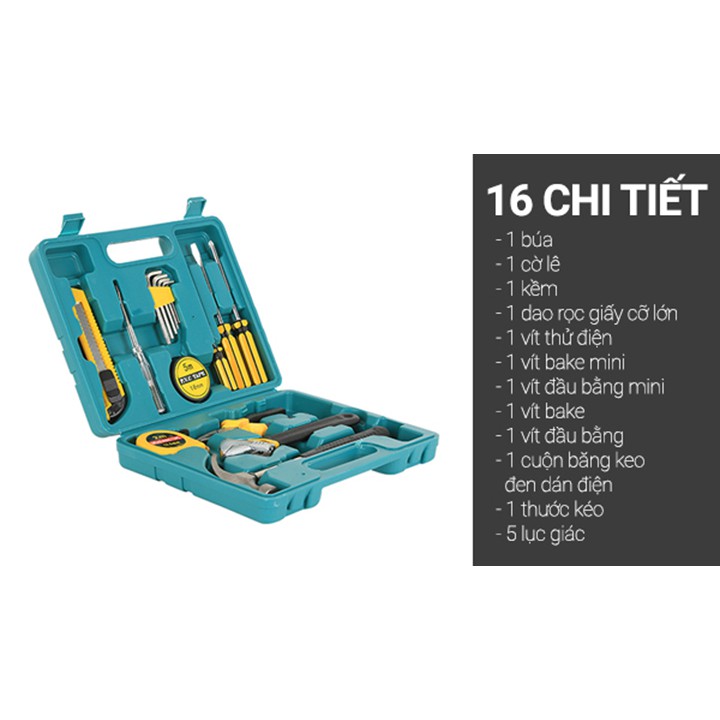 Bộ dụng cụ sửa chữa gia đình đa năng có tới 16 dụng cụ khác nhau nhỏ gọn, bền bỉ và tiện lợi dùng trong sửa chữa, lắp đặt đối với cả công việc gia đình. Sản phẩm mang đến hiệu suất làm việc cao khi được đựng trong một chiếc hộp với kích thước nhỏ gọn, cung cấp không gian lưu trữ, cất giữ các vật dụng sửa chữa một cách thuận tiện và hợp lý nhất. Đây chắc chắn sẽ là sản phẩm làm bạn hài lòng một cách tuyệt đối.