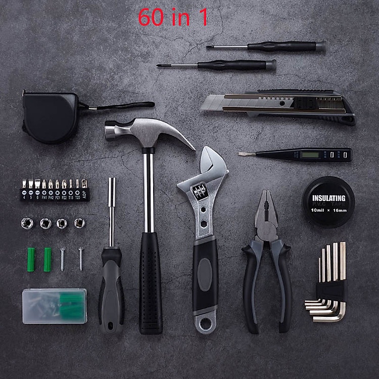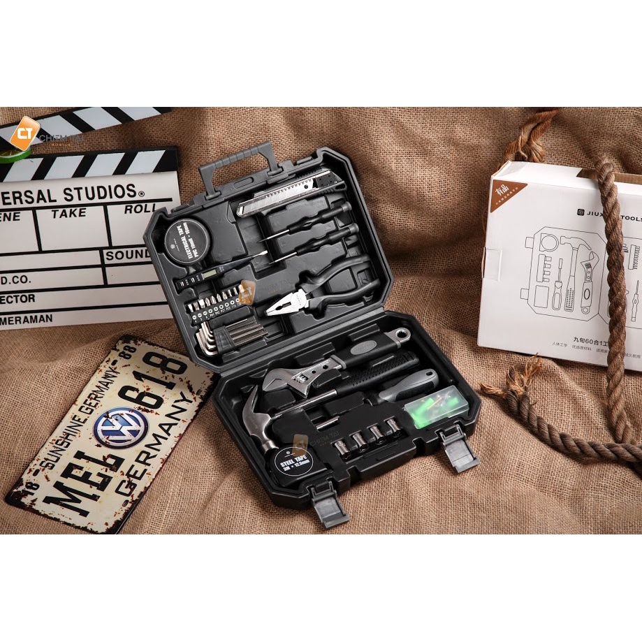 Điểm độc đáo của bộ dụng cụ đa năng Jiuxun Tools đó là tích hợp 60 công cụ trong 1 bộ sản phẩm, giúp người dùng dễ dàng tìm được công cụ sử dụng phù hợp. Cụ thể bộ sản phẩm bao gồm băng keo cách điện, dao rọc giấy, tuốc nơ vít dẹp, kìm, búa, thước dây 3m, bộ 5 khóa lục giác, cờ lê, bút thử điện, 2 tuốc nơ vít nhỏ, 1 tuốc nơ vít có thể đổi đầu vít và bộ đầu vít ốc vít, 1 hộp lưu trữ. Với số lượng sản phẩm lên đến 60 vô cùng phong phú, Jiuxiun Tools cho khả năng đáp ứng mọi nhu cầu sử dụng từ cắt dây điện, cố định đinh bị lỏng, vặn vít trong bàn ghế, quạt điện, máy tính, kiểm tra mạch....