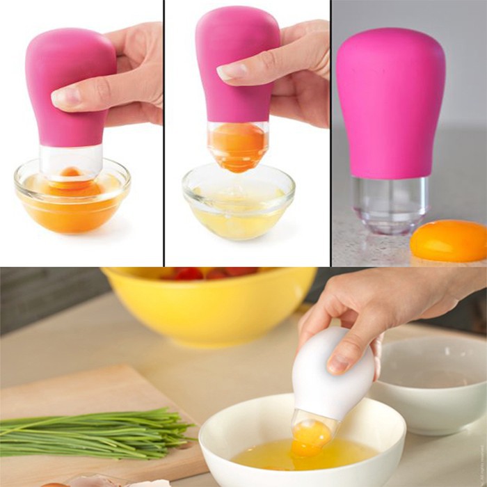 Cách sử dụng rất đơn giản. Đầu tiên, bạn đập số lượng trứng cần dùng ra tô. Sau đó đưa phần đầu của dụng cụ lại gần lòng đỏ trứng, bóp nhẹ phần thân rồi thả tay để hút lòng đỏ vào trong. Đưa miệng dụng cụ sang một chiếc tô khác rồi bóp nhẹ để lòng đỏ trứng trôi xuống.